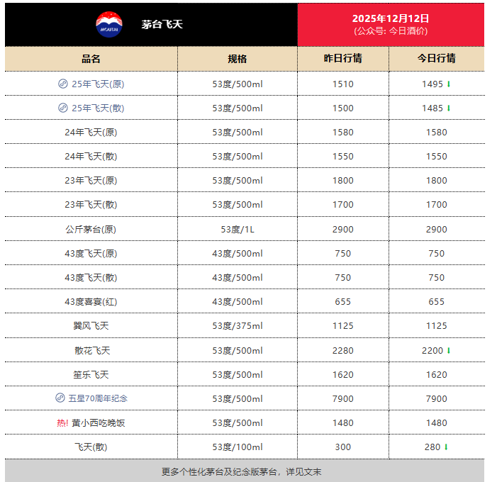 今日酒价披露各大名酒批发参考价显示,12月12日,25年飞天茅台(原箱)较前一日下跌15元,报1495元/瓶;25年飞天茅台(散瓶)较前一日下跌15元炒股入门知识配资平台,报1485元/瓶。